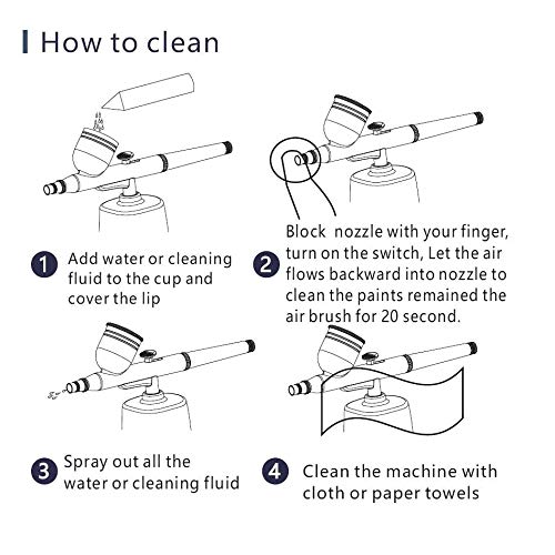 - ★ USAGE: Install the airbrush gun with the air compressor. Full fluid the spray cup with makeup foundation or painting ink, then hold the airbrush lightly in your hand. Pressing then drawing backward for spray atomization.