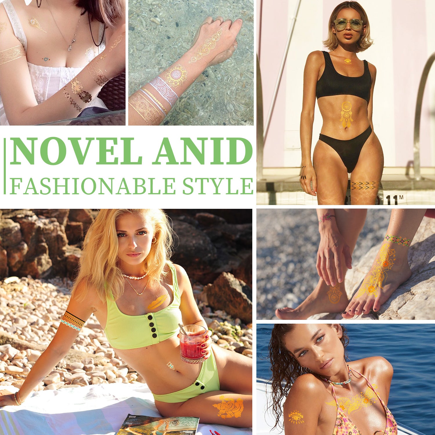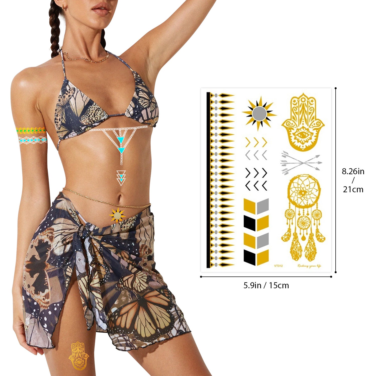 MULTI TATTOOS STICKERS DESIGN --- Colorful/Silver/Gold Tattoos, Mandala/Flowers/Butterfly/Jewelry/Feathers/Talisman/Boho/Abstract Graphics,Etc. It can be attached to your arms, shoulders, hands, ankles, chest, back, legs or any other parts of your body. Full directions are in the back of each sticker.