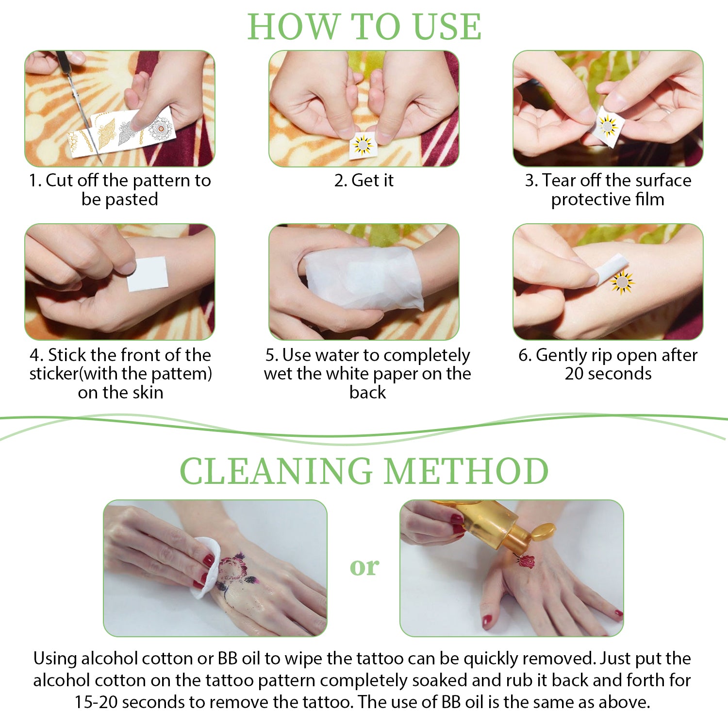WATERPROOF AND REMOVABLE GOLD TEMPORARY TATTOOS --- Long last for 2-5 days,these gold tattoo stickers are water resistant, so you can swim, take shower or sweat without worrying. The fantastic pattern display will leave a good impression, there are no longer envy others good-looking tattoos when you walking on the road. Easy to apply in 10-20 seconds with just water, and if you make changes to other patterns,you can easily remove it with rubbing alcohol,body oil,olive oil.