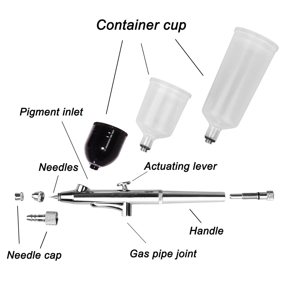 - ★ USAGE: Install the airbrush gun with the air compressor. Full fluid the spray cup with makeup foundation or painting ink, then hold the airbrush lightly in your hand. Pressing then drawing backward for spray atomization.